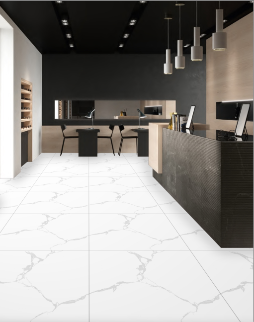 Đối với cách khu trung tâm thương mai, đại sảnh lớn điều cần có đầu tiên à gây được sự chú ý và tạo cái nhìn ấn tượng từ ban đầu. Bởi vậy, gạch khổ lớn màu trắng với các đường vân trằng chịt sẽ giúp bạn lo điều đó, thiết kế khổ lớn đem lại cái nhìn sang trọng và cao cấp hơn nhiều gạch bé và gạch tầm trung.