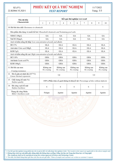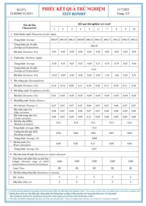 Phiếu kết quá thử nghiệm GẠCH PORCELAIN (60x60) cm